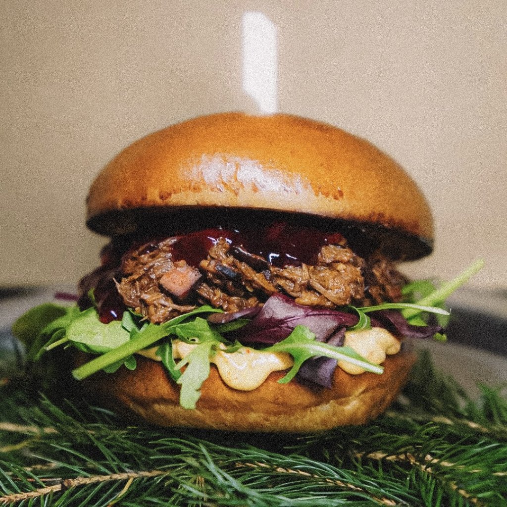 Trhané laní maso, rukola, majonéza se slaninou a karamelizovanou cibulkou, brusinky